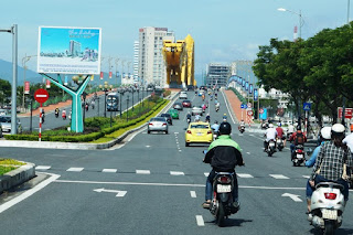 we walked across the Dragon Bridge after our dinner at Mi Quang Noodle shop....amazing lights from the city and the bridge.
